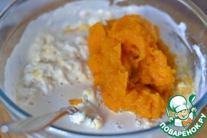 Перемешать. Добавить тыквенное пюре, перемешать.