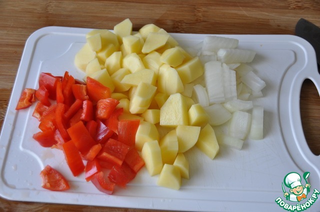 Заранее подготавливаем овощи: моем, чистим. Перец, лук и картофель режем кубиками.