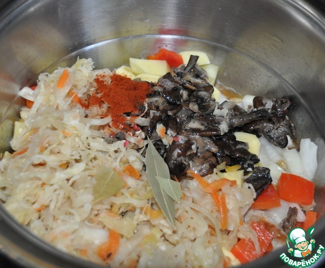 Сверху колбасок кладём нарезанные овощи. Далее кладём квашеную капусту, если кислая, то лучше смыть. Добавляем любые грибы по желанию, у меня жареные опята, собранные позавчера. Добавляем лавровый лист, смесь перцев горошком, сладкую паприку. Блюдо не солим. Воду не добавляем.