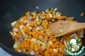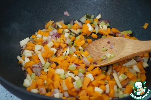 В глубокой сковороде на растительном масле обжарить лук, тыкву, сельдерей (оба вида). Добавить тимьян (листочки). Готовить до золотистого цвета.