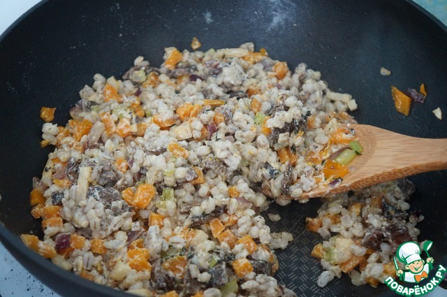 Добавить перловку, сметану, грибы. Соль и перец по вкусу.