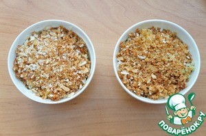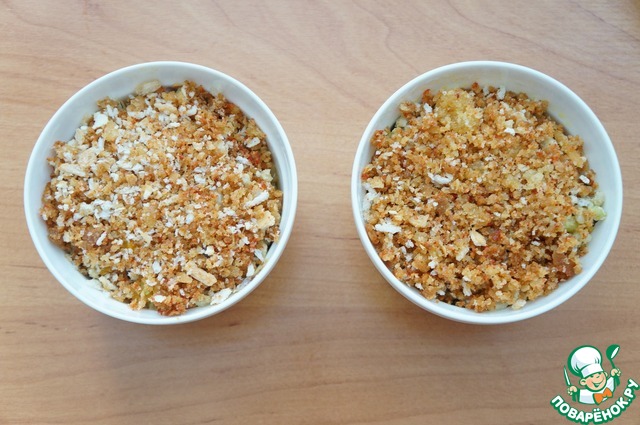 Сухари обжарить на сливочном масле, смешать с паприкой и присыпать сверху формочек.