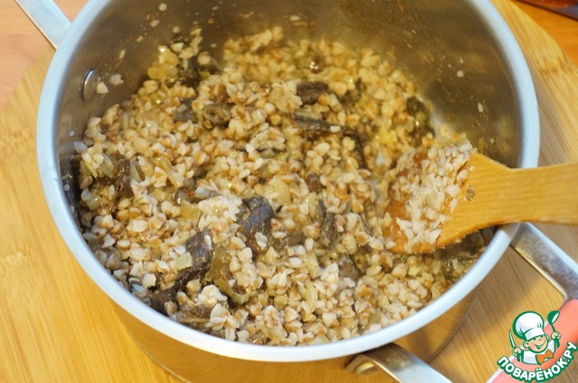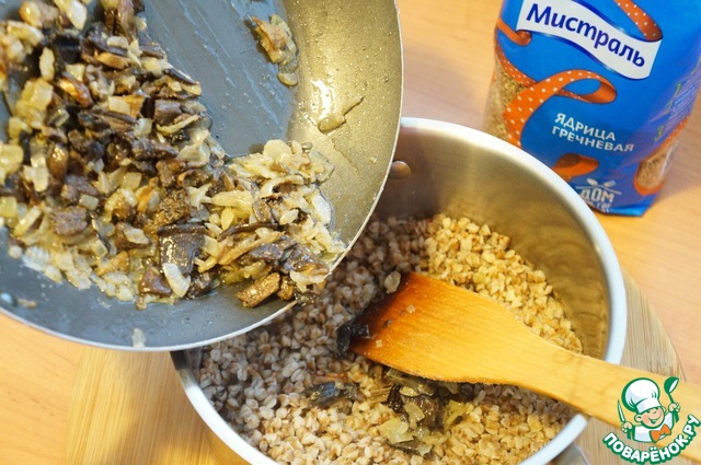 Выложить лук с грибами в готовую гречку.