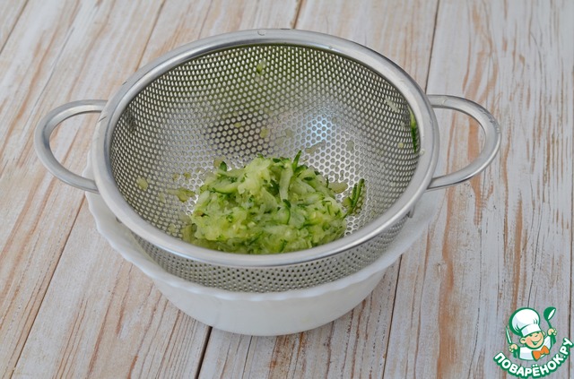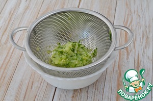 Через дуршлаг отжать лишнюю жидкость в цуккини. -