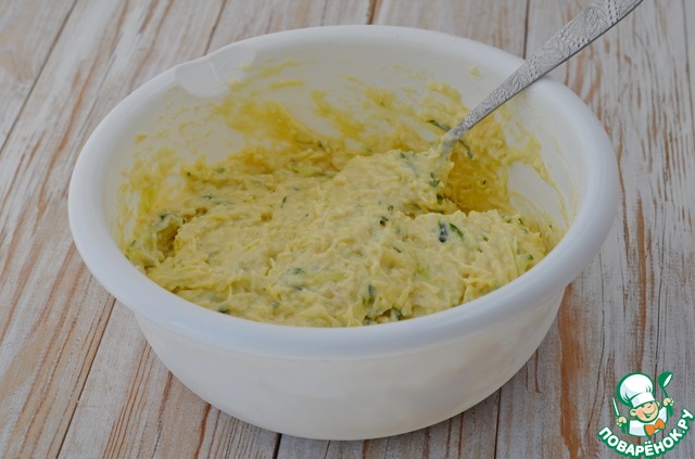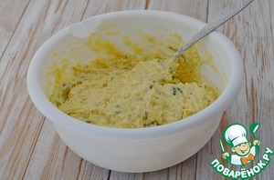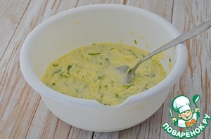 Смешать цукини с молоком, яйцами, маслом, натертыми на средней терке сыром и чесноком, поперчить, если нужно досолить, перемешать.