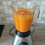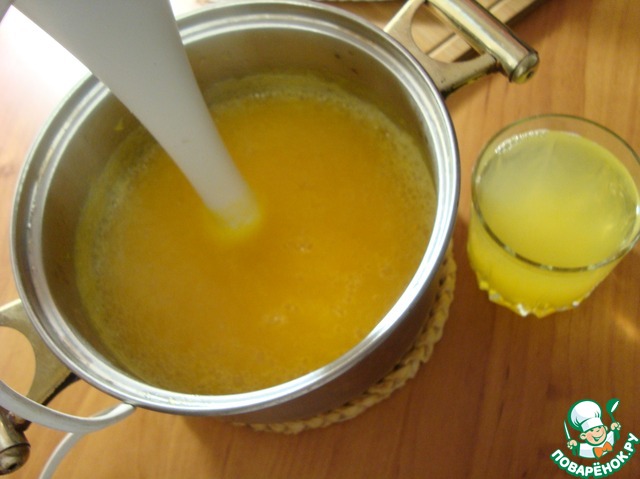 Варим тыкву до готовности. Снимаем с огня. Сливаем воду в какую-то посуду и разбиваем тыкву блендером. Водичку из под тыквы можно доливать понемногу, если вам показалось, что пюре густое-сделать по плотности по вкусу.