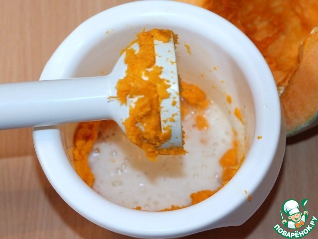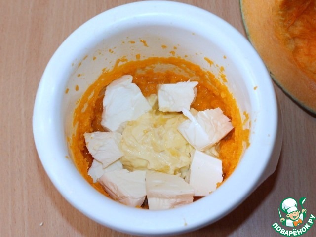 3. К тыкве добавить мягкое масло, сырок и снова пюрировать смесь.