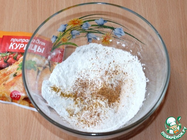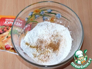 4. В отдельной миске смешать сухие ингредиенты: муку, смесь трав, приправу и соль. Я решила попробовать добавить пряности для курицы 0,5 ч. л.