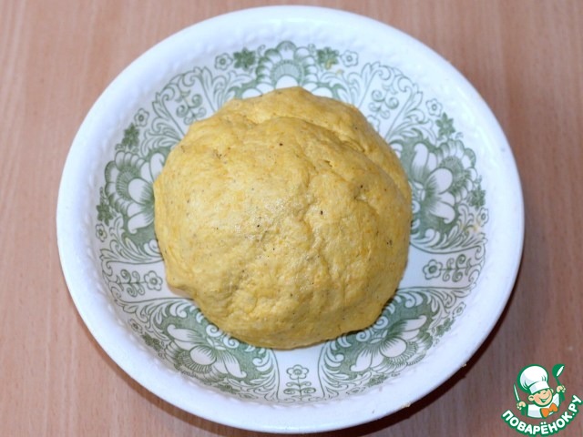 5. Тыквенную смесь смешать с мучной смесью, вымесить тесто. Затем по 1 ст. л. добавлять муку и вымешивать тесто. У меня ушло еще 6 ст. л. без горок. Тесто должно быть мягкое, гладкое и не липнущее к рукам. Пальчики можно смазать растительным маслом.