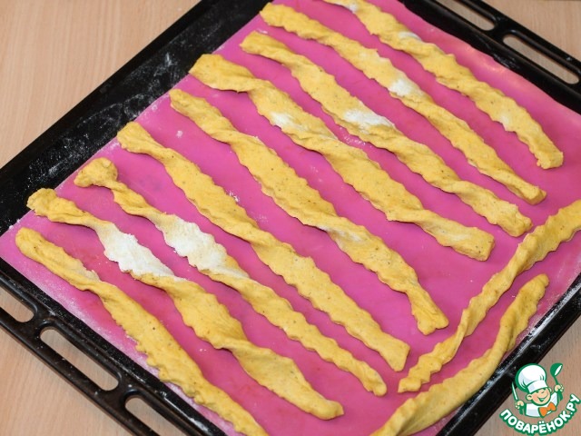 7. Разложить полоски на расстоянии друг от друга на противне или на решётке. Выпекать палочки в хорошо разогретой духовке при температуре 190 С, 30 минут.