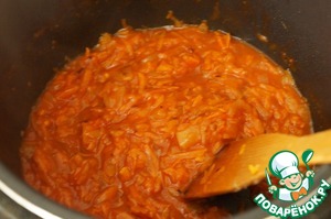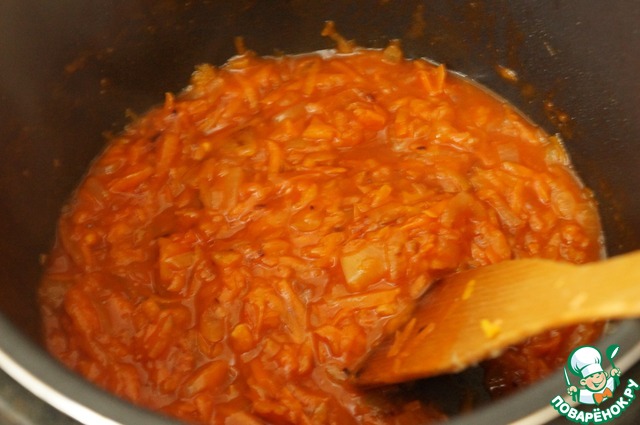 На растительном масле обжариваем рубленные лук и чеснок, добавляем тёртые морковь и тыкву. Через пару минут кладём томатную пасту, перемешиваем, всыпаем муку, перемешиваем. Солим, вливаем воду.