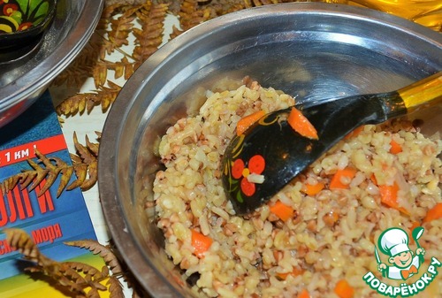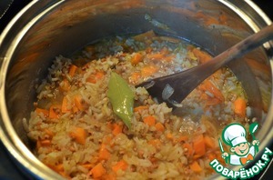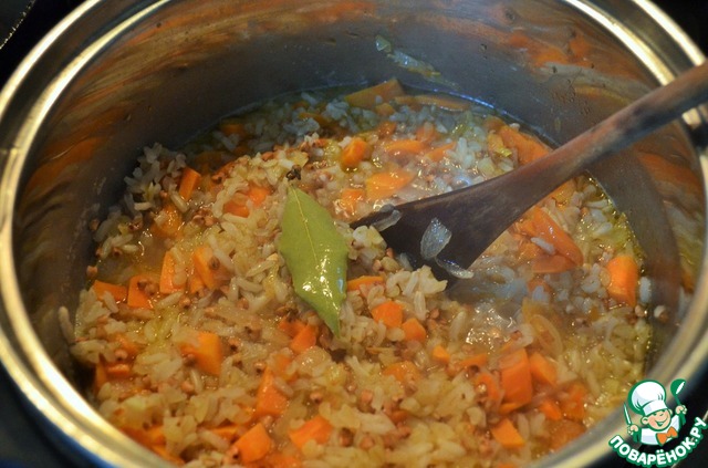 Через 5 минут после закладки гречневой крупы выложить зажарку, перемешать, посолить по вкусу, добавить лавровый лист. Довести до готовности.
