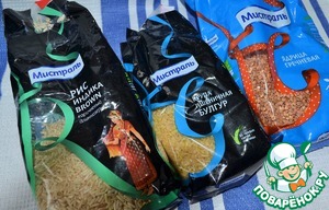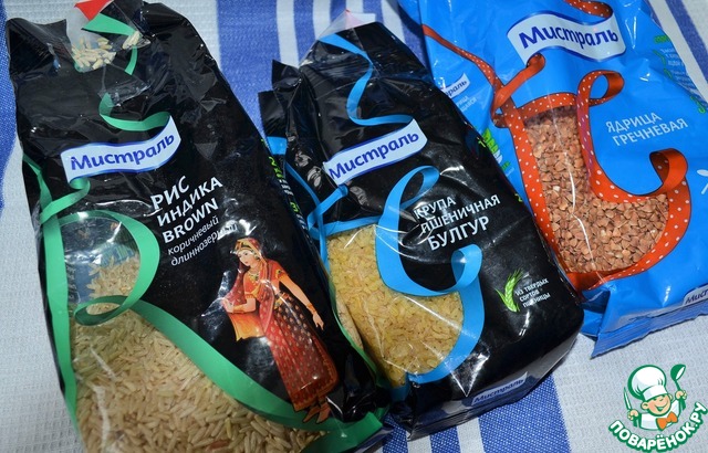 Вот они - наши "остатки", замечательные крупы от ТМ Мистраль. Рис коричневый, булгур и гречневая крупа.