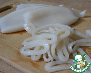 Нарезать тушки кальмара (у меня кальмар был замороженный чищеный).