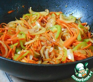 В глубокой сковороде на растительном масле слегка обжарить лук, перец и морковь по-корейски.