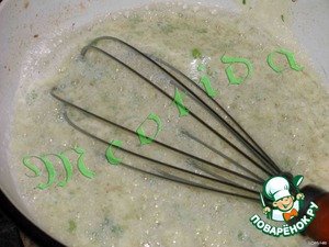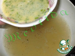 выливаем яйцо в бульон, постоянно помешивая венчиком -