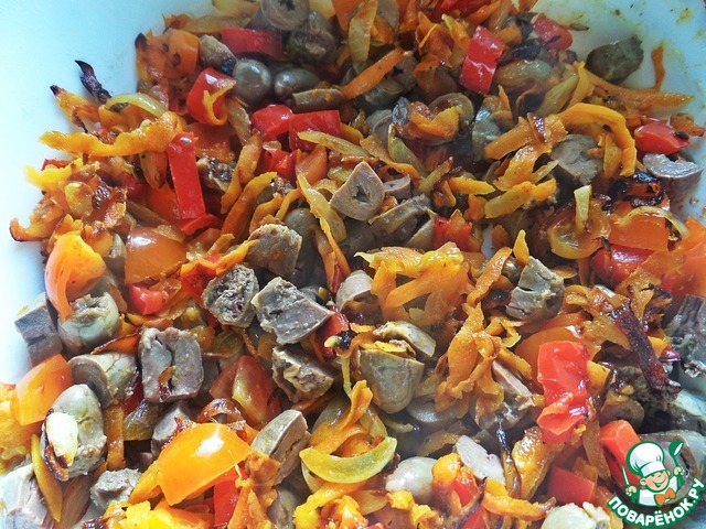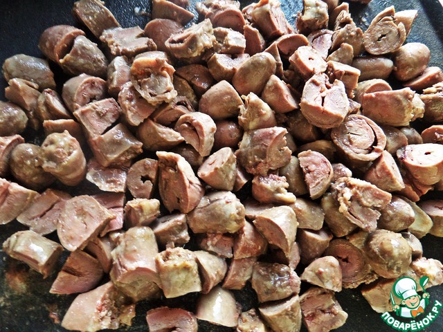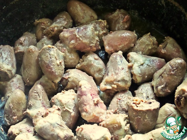 Сердечки очистить от жирных крайчиков, залить водой и заранее отварить минут 20.