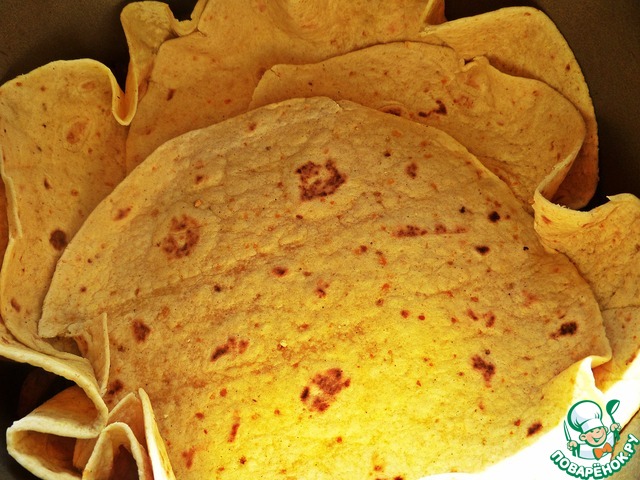 Смазываем форму обильно маслом (у меня съёмная диаметром 21 см) и вдавливаем в неё все тортильи, образуя бортики.