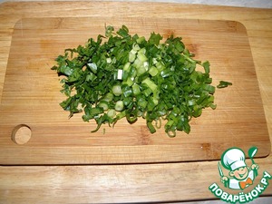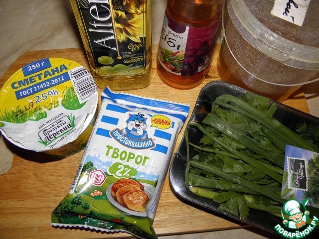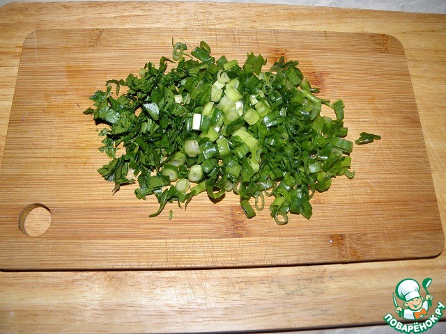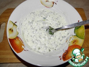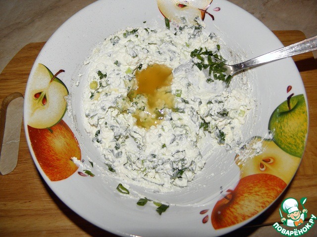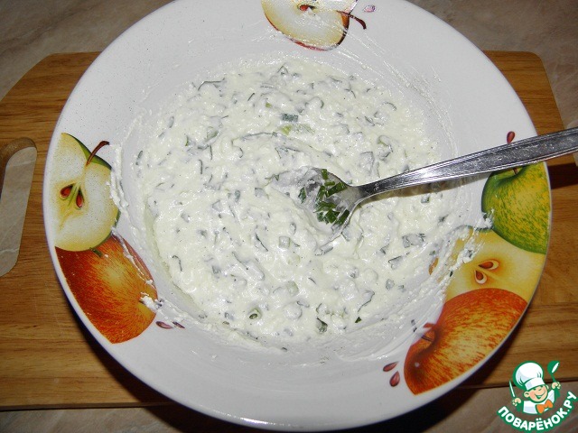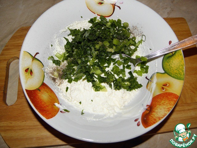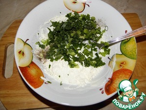 Добавить зелень в творожно-сметанную массу, посолить, поперчить, все перемешать