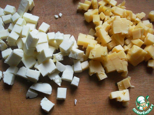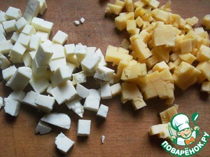 Оба вида сыра порезать кубиками 1*1см