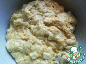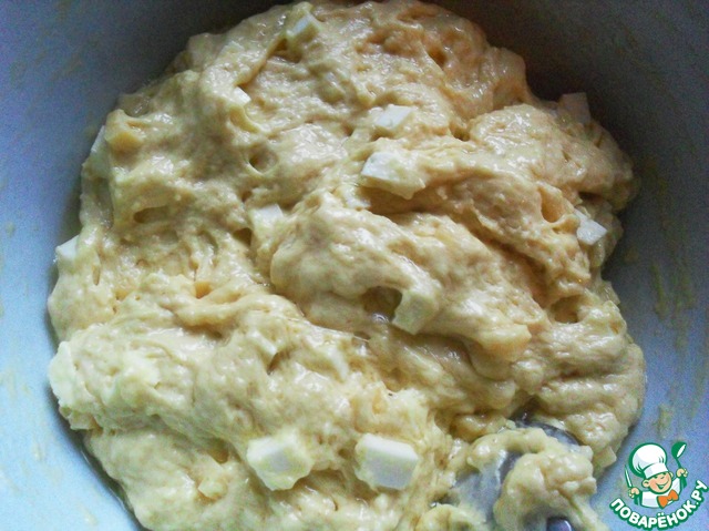 Вмешать в тесто сыры и добавить муку. Замесить тесто, стараясь не поломать кубики.