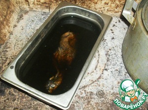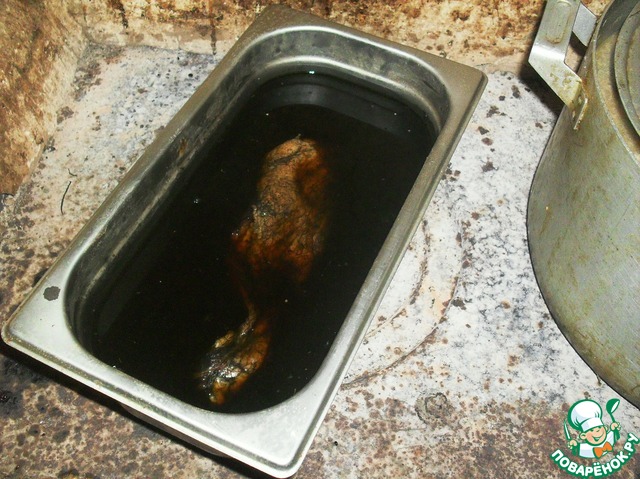 Мясо вынимаем, остужаем и промываем холодной кипяченой водой от остатков сажи.