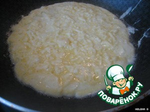 Делаем тесто для блинов: взбиваем 2 яйца с молоком, потом добавляем муку, соль, опять взбиваем и, в последнюю очередь, добавляем сыр - аккуратно перемешиваем...