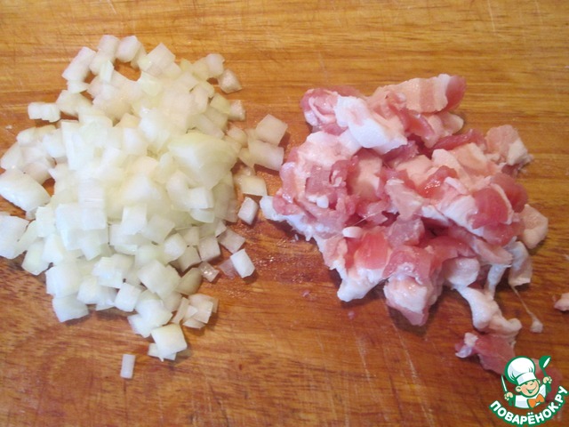 Мелко нарезать лук и бекон и спассеровать их до золотистого цвета.