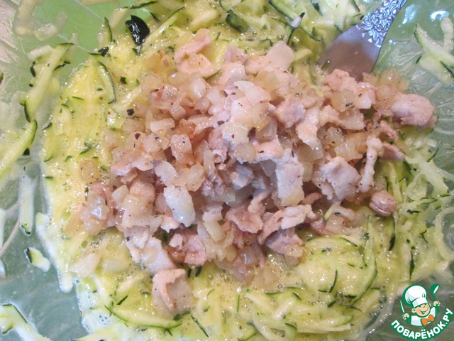 Взбить яйца с сахаром и солью, кабачок натереть на крупной терке и хорошо отжать. Муку просеять и смешать с разрыхлителем. Соединить все ингредиенты и добавить к ним обжаренные лук и бекон.