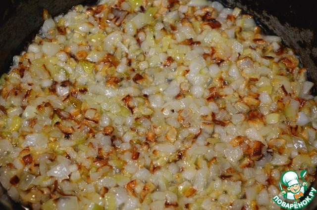 Растапливаем кусочки бекона или сала на сковороде и на этом сале жарим лук с солью и молотым чёрным перцем.