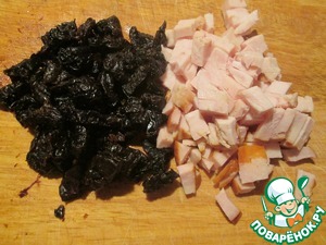 Ветчину порезать мелкими кубиками, чернослив кусочками.