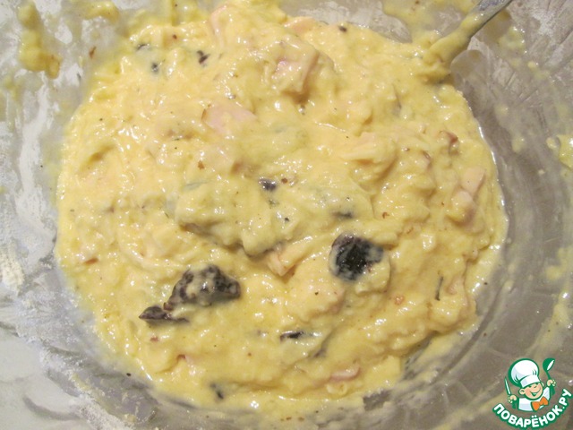 К яичной смеси добавить чернослив, ветчину, натертый сыр и муку, смешанную с разрыхлителем. Вымешать тесто.