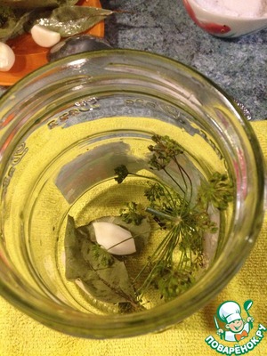 Пока грибы варятся, готовим банки. Моем, стерилизуем, накладываем в них специи. В каждую баночку кладу 1 зонтик укропа, 1 большой или 2 маленьких лавровый листа, 2-3 гвоздики, 2-3 горошка перца, 1-2 зубчика чеснока.