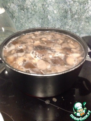 После закипания через 1-2 минуты сливаем воду, промываем грибы и заливаем снова. Доводим до кипения, снимаем пену и варим примерно 10-12 минут. -