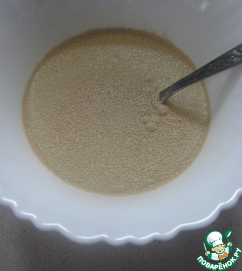 В чуть теплом тыквенном отваре растворяем сахар и дрожжи. Оставляем в теплом месте до появления "шапочки".