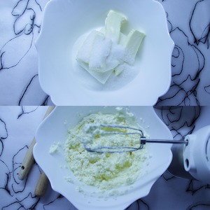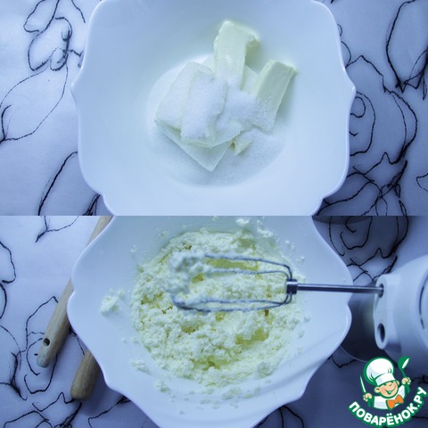 Смешать творог, сахар, сметану и сливочное масло и взбить все миксером