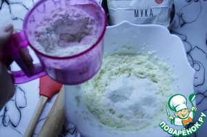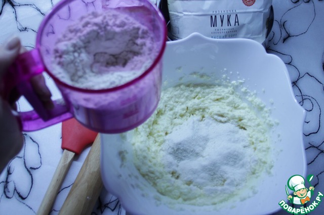 Всыпать в творожную смесь всю муку с содой