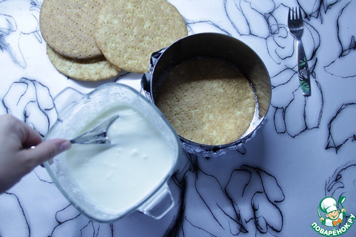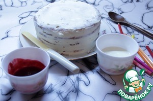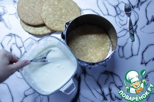 Уложить корж на дно и залить 2-3 столовыми ложками сметённого кремаи так сделать со всеми коржами
