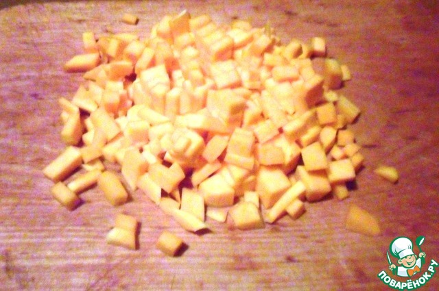 Тыкву вымыть, отрезать кусочек, очистить и нарезать мелкими кубиками.