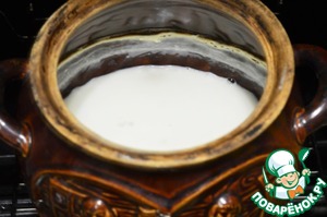 Ставлю разогревать духовку (терморегулятор у меня накрылся, теперь ставлю температуру на глаз) где-то на 100 градусов, кипячу молоко. В глиняный горшок высыпаю крупу, заливаю молоком, солю. Ставлю горшок в духовку, ещё убавляю газ немножко.