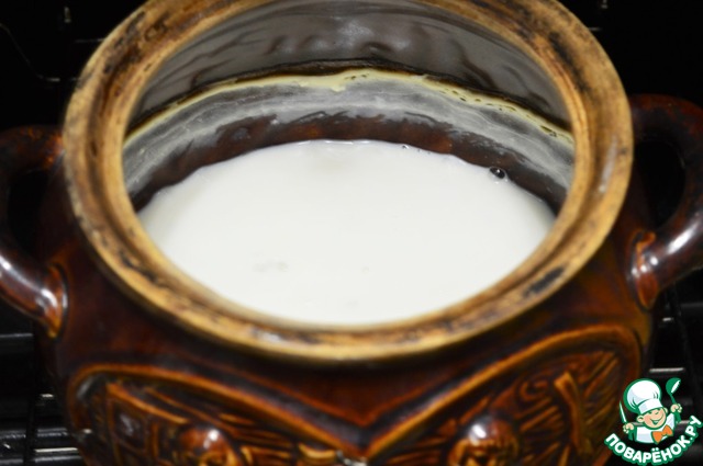 Прошло 2,5 часа. Я начала нервничать - по дому пошёл запах слегка подгоревшего молока. Я понимаю, что это на стенках горшка горит, но не выдерживаю и достаю. И правильно, больше жару в духовке и не надо. Выключаю газ и оставляю горшок с перловкой ещё на час в духовке.