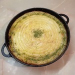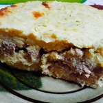 Выложить мясо на первый слой картошки и разровнять. Накрыть оставшейся частью массы, снова разровнять, смазать яйцом и запекать в духовке до золотистой корочки.