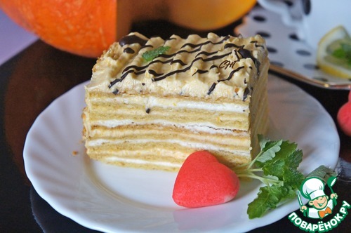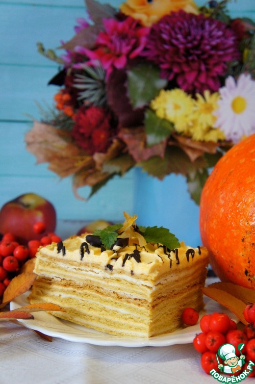 Невероятно нежный, мягкий и очень ароматный торт! Немного напоминает по вкусу медовый, но крем... Крем просто... Сочетание слегка кисленького творожного и нежного ароматного тыквенного просто фантастическое! Принц наверняка был бы очень доволен, если бы Золушка подала ему на десерт такой торт! Рецепт довольно хлопотный, придется повозиться, но результат того стоит.