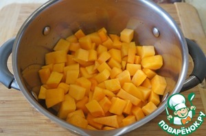 Сырую тыкву очистить, нарезать кубиками примерно 500 г мякоти, всыпать в кастрюльку, влить немного водички и проварить на небольшом огне до мягкости.