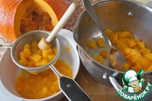 Взбить блендером. Мой любимый блендер несколько дней назад приказал долго жить, пришлось протереть тыкву через сито.