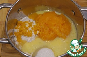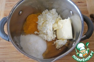 В кастрюльку протереть сквозь сито творог, добавить сахар, масло, мёд и тыквенное пюре. Все тщательно перемешать.