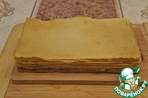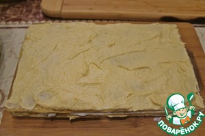 Я взяла форму размером 16 х 26 см по дну (не нашла квадратную 20 х 20), вырезать 2 куска пекарской бумаги такого же размера. Раскатывать тесто прямо на бумаге поочередно на одном и втором куске. Пока один печется, подготавливать второй. Коржи у меня получились очень тонкими, я с трудом раскатала тесто по пекарской бумаге. -