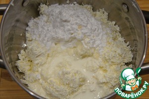 В кастрюльку протереть творог, добавить сахарную пудру, сок и сливки. -