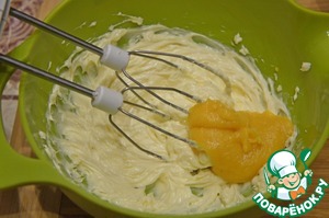 Взбить размягченное сливочное масло, добавляя по частям заварной тыквенный крем, и не переставая взбивать, до получения густого крема.