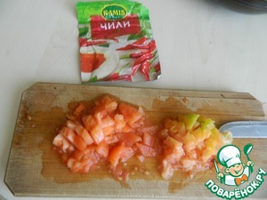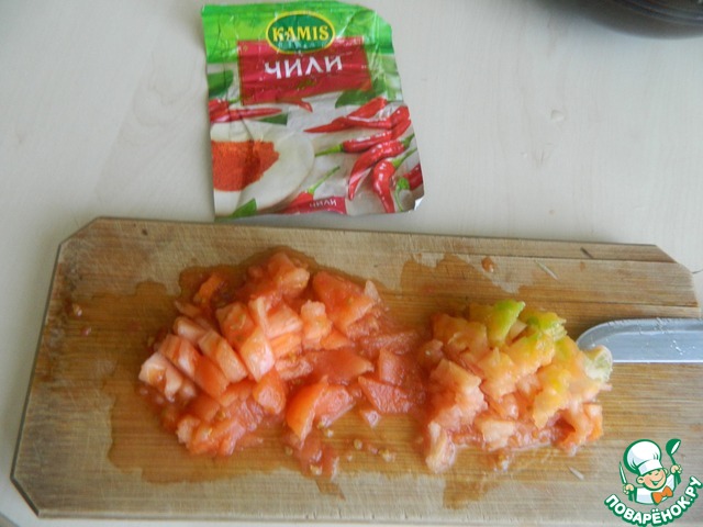 Снимем с помидор кожицу и измельчим. Добавим помидоры в сковороду вместе с молотым перцем чили и томатным соусом (я использовала домашние томаты в собственном соку). В оригинале рецепта предлагается взять консервированные томаты.